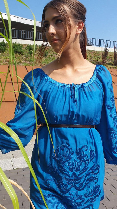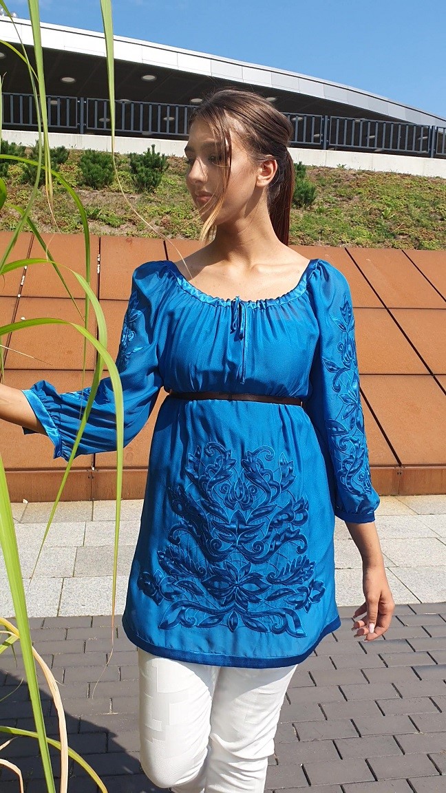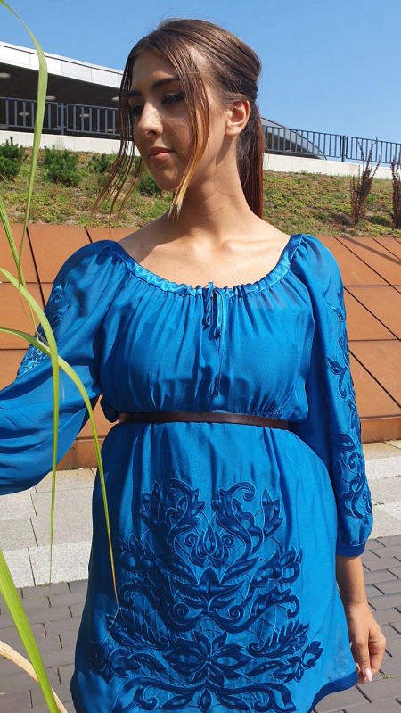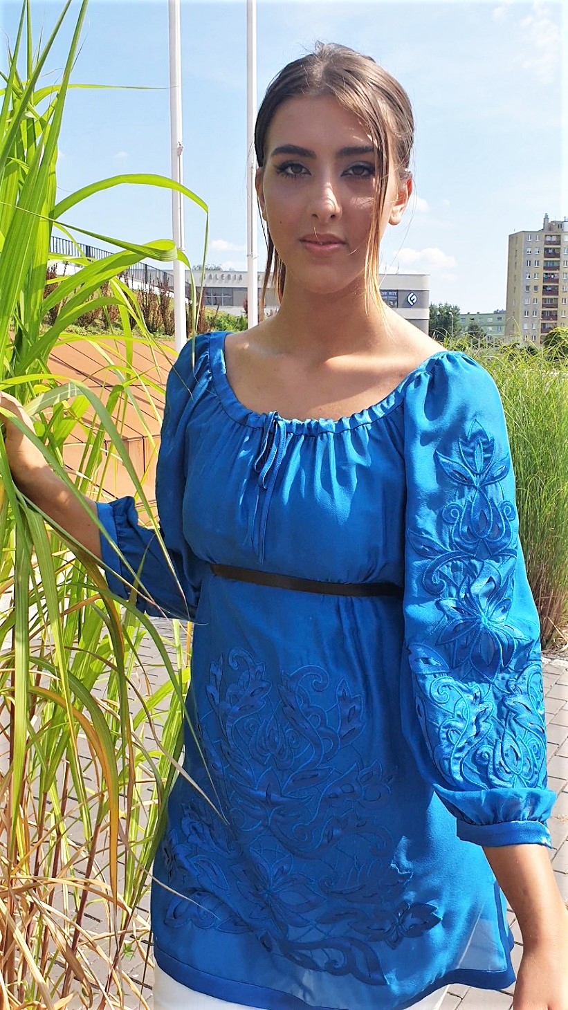 Niebieska tunika marki Philosophy di Alberta Feretti. Piękne, jedwabne ubranie, synonim najwyższego poziomu luksusu. Piękne hafty, połączone z pięknymi wycinankami tworzą niepowtarzalne ubranie, obok którego nie można przejść obojętnie. Tunika cięta pod biustem. Czarny wąski pasek nie jest fragmentem kompletu, został wykorzystany dodatkowo do sesji zdjęciowej. Na dole po bokach tunika jest delikatnie rozcinana i dekorowana pojedynczymi kryształkami Svarowskiego. Tunika posiada osobną halkę z bocznym suwakiem. Prać chemicznie. Uwaga! Ubranie w II gatunku (tunika posiada błędną metkę papierową z linii Alberta Feretti, zamiast Philosphy di Alberta Feretti.
