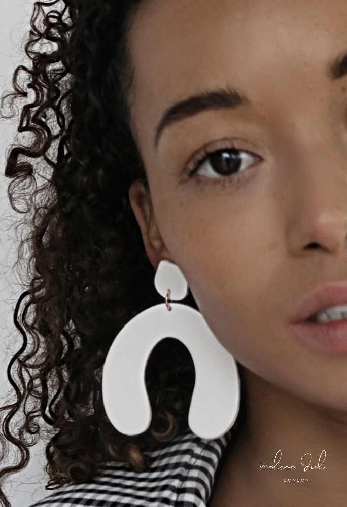 UNO, duże, kolczyki wykonane ze skóry naturalnej projektu Maleny Dul. Ciekawy, nowoczesny ksztalt i klasyczna biel, nadasza lekkosci i elegancji każdej stylizacji, od klasycznej po sportową. Lekkie i wygodne.