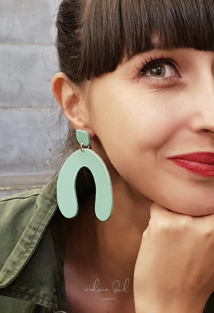 UNO, duże, kolczyki wykonane ze skóry naturalnej projektu Maleny Dul. Geometryczny, charakterystyczny kształt oraz piękny zielony kolor w modnym odcieniu pastelowej mięty, że nikt nie przejdzie obok Ciebie obojętnie. Spektakularna bżuteria, doda pazura każdej stylizacji, od klasycznej po sportową. Lekkie i wygodne.