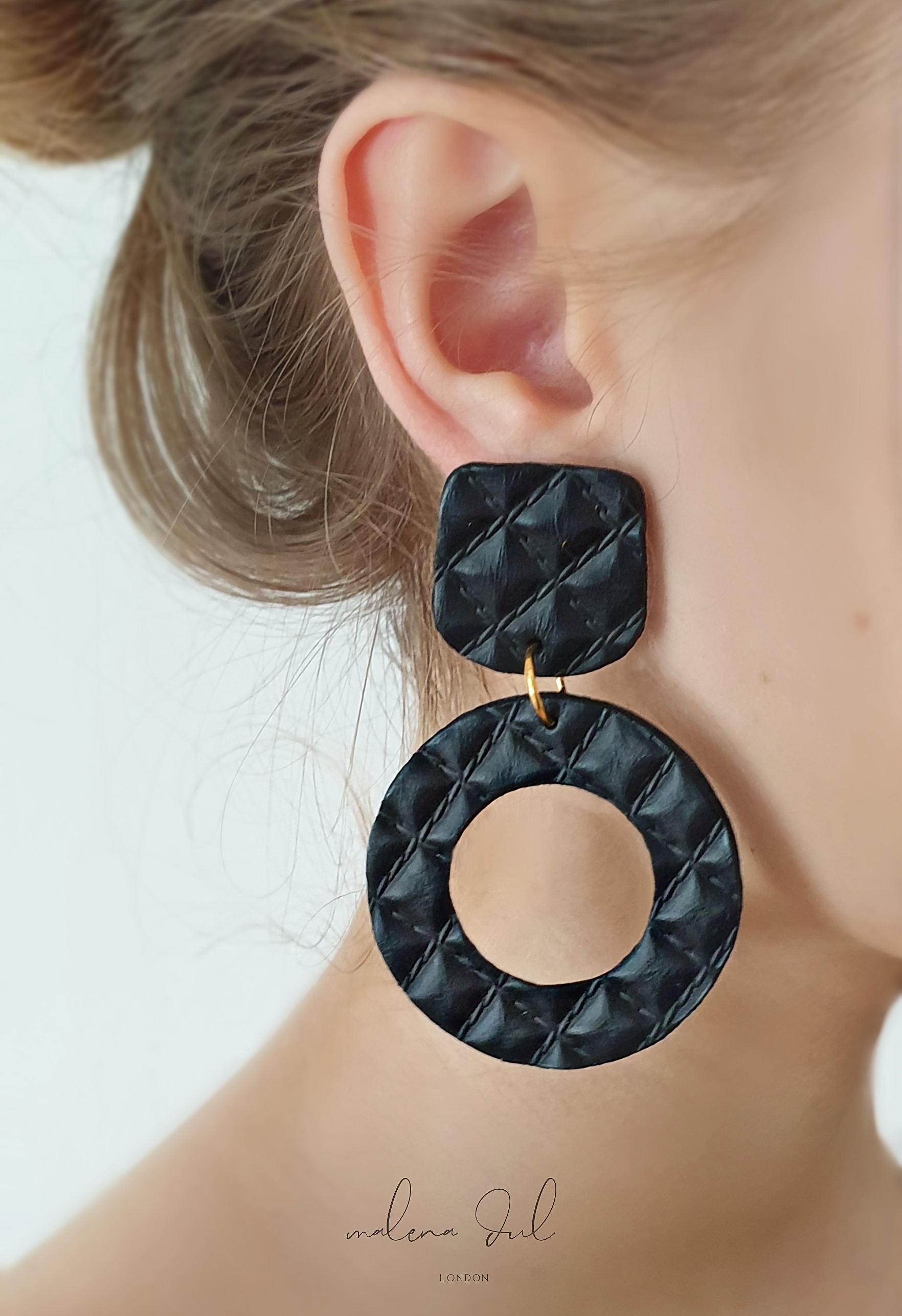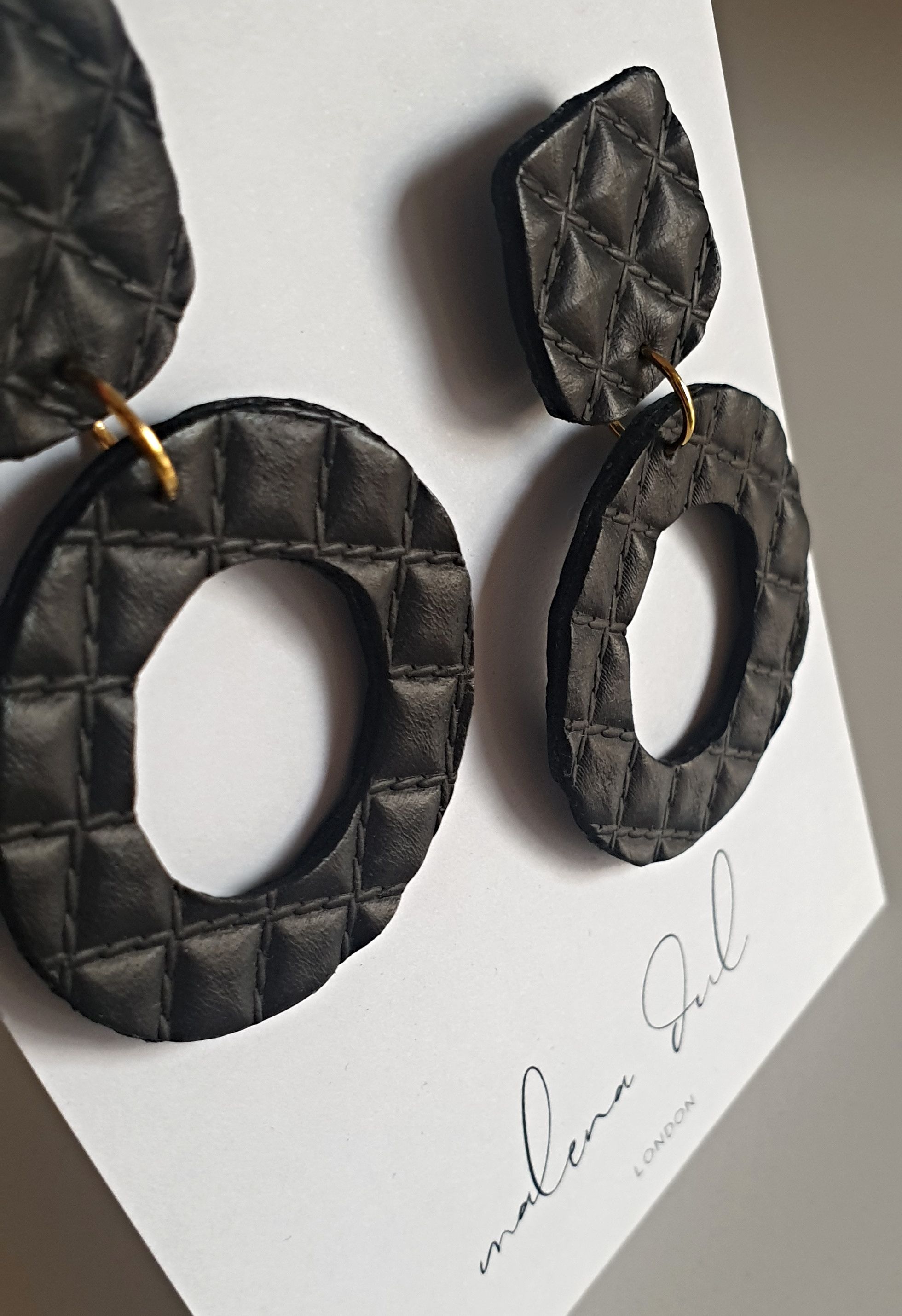 Kolekcja VENUS Inspirowana kobiecością, delikatnością oraz ''miekkimi łukami''. To koktailowe kolczyki w kilkunastu kolorach i wzorach. Duże i bardzo efektowne. Wykonane czarnej, pikowanej skóry naturalnej. Niezmiernie eleganckie. Możesz je skomponowac z białym t-shirtem i jensami, suknią wieczorową czy dobrać do wieczorowego outfitu. Lekkie i wygodne. Kolczyki występują w kilku kolorach/wzorach.