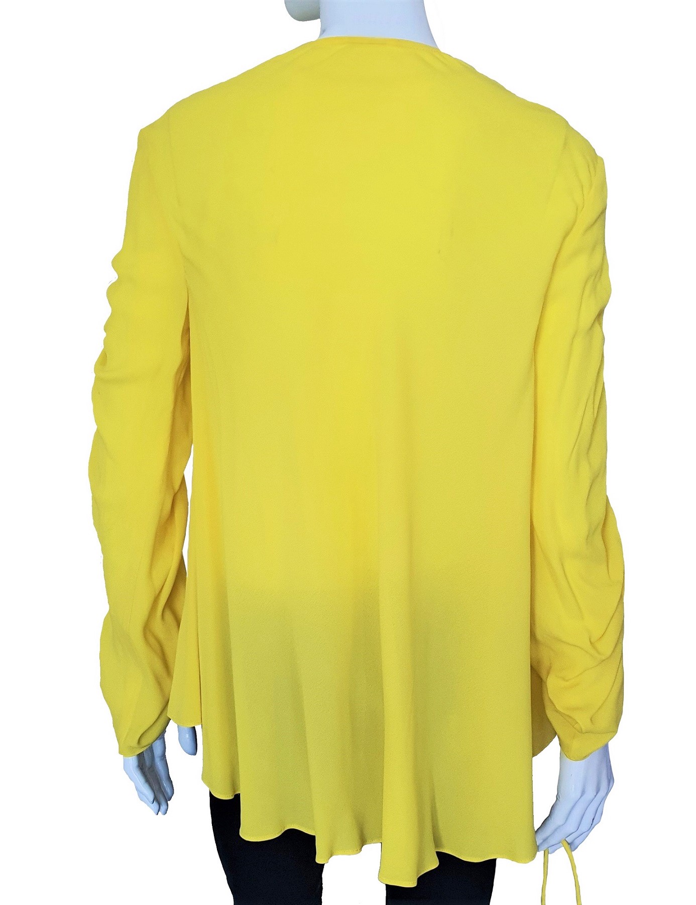 Żółta bluzka Pinko. Elegancja z rękawami ściganymi na troczki, dzięki którym reguluje się ich długość oraz zmienia wygląd. Bluzka z cienkiej "lejącej" tkaniny typu "żorżeta". Ten piękny, intensywny, cytrynowy, rzadko spotykany kolor będzie doskonale łączył się z błękitem, bielą, czy seledynem, ale także na przykład z ciemnogranatowymi jeansami. Krój trapezowy, bardzo rozszerza się w pasie, więc zasłoni także wszelkie, nawet solidne fałdki. Uwaga - II gatunek, bluzka nie posiada papierowej metki (ostatnia sztuka).
